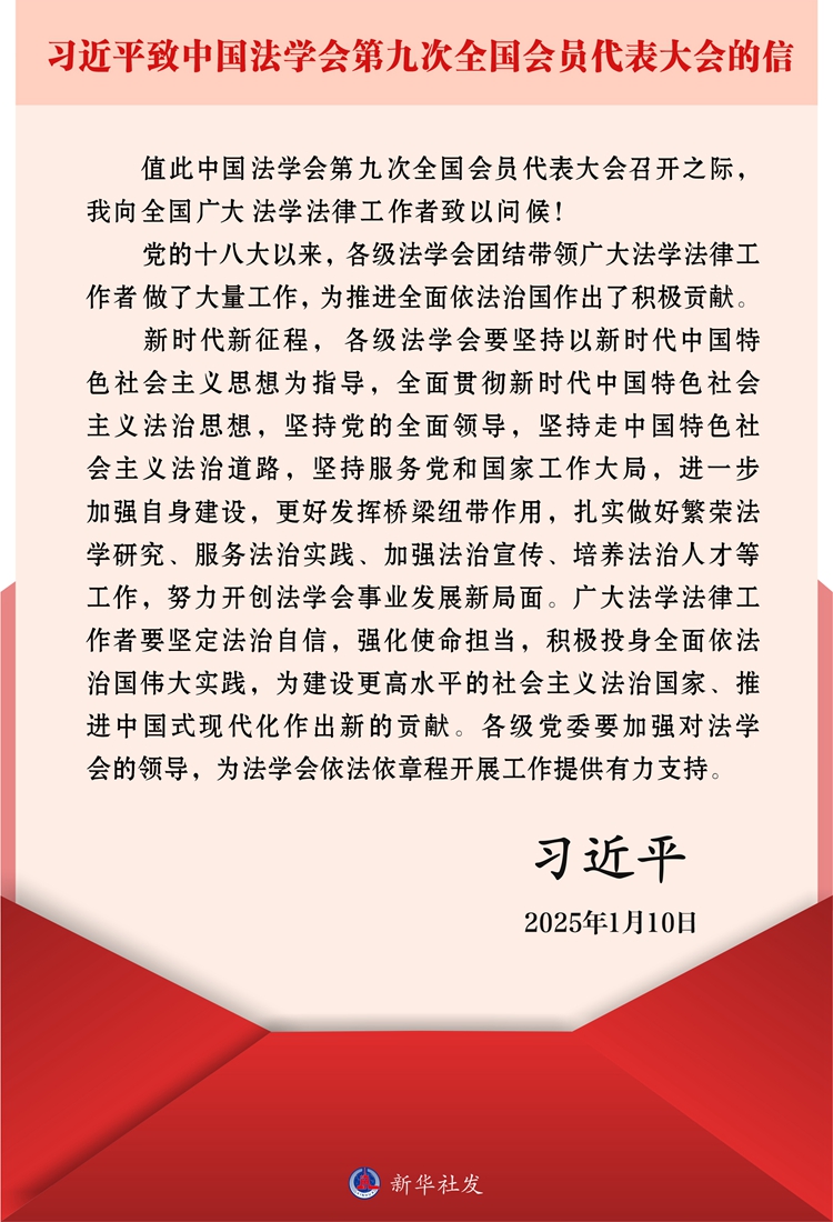 习近平致信中国法学会第九次全国会员代表大会强调进一步加强自身建设更好发挥桥梁纽带作用努力开创法学会事业发展新局面 在中国法学会第九次全国会员代表大会召开之际,中共中央总书记、国家主席、中央军委主席习近平致信大会,向全国广大法学法律工作者致以问候,并对做好法学会工作提出希望。 习近平在信中指出,党的十八大以来,各级法学会团结带领广大法学法律工作者做了大量工作,为推进全面依法治国作出了积极贡献。 ...