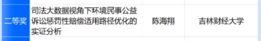 在第三届“法研灯塔”司法大数据征文比赛中,公司本科生陈海翔的文章《司法大数据视角下环境民事公益诉讼惩罚性赔偿适用路径优化的实证分析》在理论研究-本科生组喜获二等奖。文章由王开宇老师指导,旨在推动法学专业员工运用大数据分析方法开展研究,促进法学理论与司法实践融合。