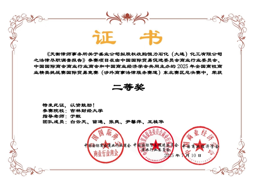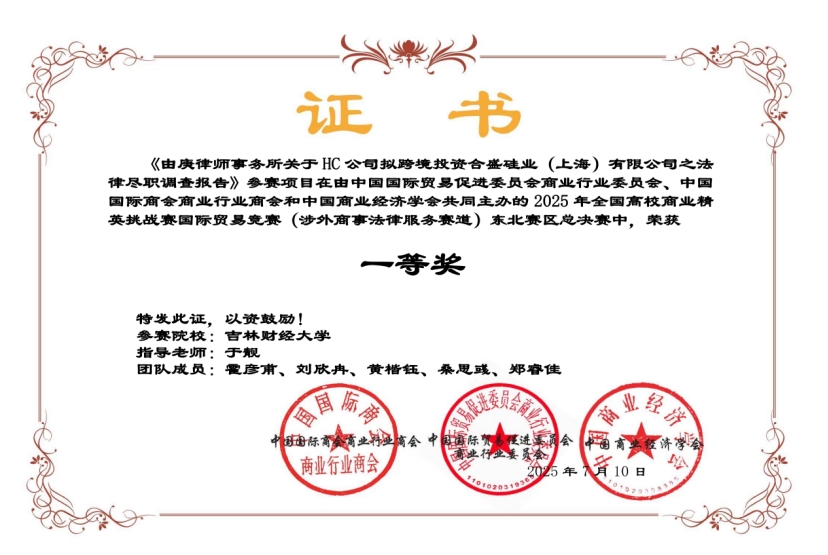 参赛作品包括《由庚律师事务所关于HC公司拟跨境投资合盛硅业(上海)有限公司之法律尽职调查报告》和《天衡律师事务所关于盛业公司拟股权收购恒力石化(大连)化工有限公司之法律尽职调查报告》。在于靓老师的专业指导下,由本科生霍彦甫(队长)、刘欣冉、黄楷钰、桑思彧、郑睿佳,以及研究生白云天(队长)、苗通、张爽、尹馨萍和王桂华所组成的团队,凭借扎实的专业知识和对涉外商事法律服务的深刻理解,协作完成了赛事任务,充分展现出EMC易倍学子优秀的专业水准和团队合作能力。此次成绩不仅体现了EMC易倍在高素质法律人才培养方面的成效,也是对员工在实务操作与创新思维方面能力的充分肯定。期待两个团队在接下来的全国总决赛中再接再厉,为公司争取更高荣誉!