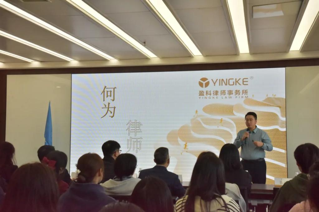 参观过后,盈科律师学经理春分院经理丁法荣为活动致辞。丁法荣经理对同学们的到来表示热烈欢迎,他详细介绍了盈科律师事务所国际化、专业化、数智化、碳中和的高质量发展方向,同时他还结合“盈科”二字“源泉混混,不舍昼夜,盈科而后进”的渊源以及公司“明德崇实”的校训,勉励同学们持续学习、开拓进取。
