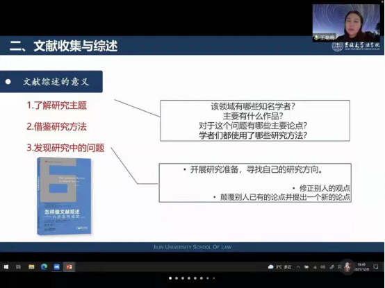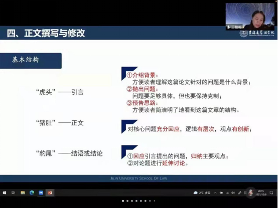 12月8日晚,王艳梅教授作“法学论文写作指导”主题讲座,围绕选题范围与来源、文献收集与综述、开题报告与写作准备、正文撰写与修改依次展开。提出在选题问题上,提出问题比解决问题更重要;对于文献收集与综述,应进入学术传统,寻找研究方向;撰写开题报告与准备写作过程中,坚信好的综述是开题的一半,好的写作准备是写作的一半;撰写正文过程中,秉持逻辑至上。提问环节,同学们针对学习困惑与未来发展提出问题,王艳梅教授耐心细致一一作答。