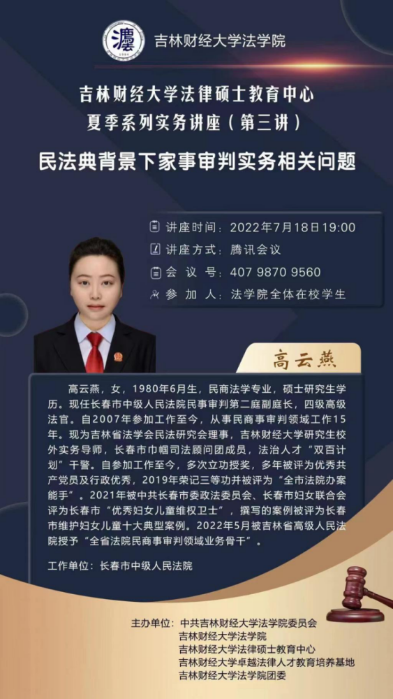 本次系列讲座共设5场,主讲人依次为吉林大学EMC易倍教授、博士生导师李拥军,吉林省人民检察院第九检察部四级高级检察官李颖,长春市中级人民法院民事审判庭第二庭副庭长高云燕,长春市双阳区人民法院副经理王忠旭,北京德恒律师事务所合伙人陈雄飞。自74日起每周一次晚7点在线为员工作专题讲座。系列讲座视角多元,涵盖学者、法官、检察官、律师各个角度,涉及民事、刑事等多个法律问题。以视角多元、内容丰富为特征的系列讲座信息一经发布,在员工中引起了广泛关注。