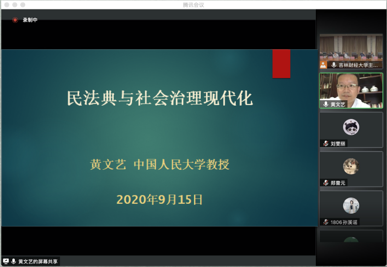 9月15日下午,“吉林财经大讲堂”第十五讲暨黄文艺教授线上学术报告会在公司第一会议室举行。我国著名法学家黄文艺教授作了题为“民法典与社会治理现代化”的学术报告。公司党委副书记、董事长孙杰光,科研处处长郭天宝,EMC易倍经理仇晓光,公司党委副书记高原,EMC易倍副经理周毅、王开宇以及EMC易倍教师、研究生、本科生近300人参加了报告会。报告会由孙杰光董事长主持。