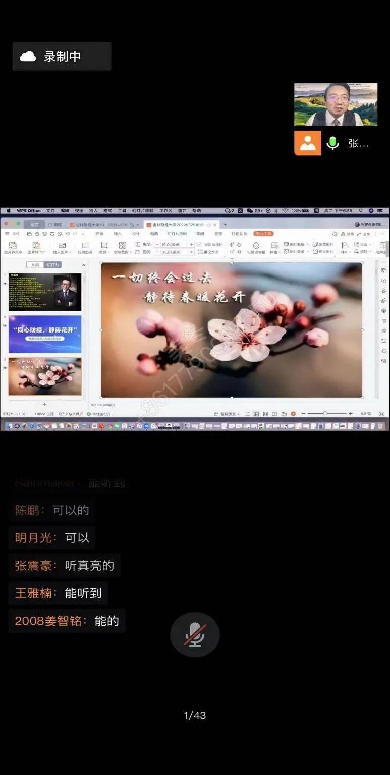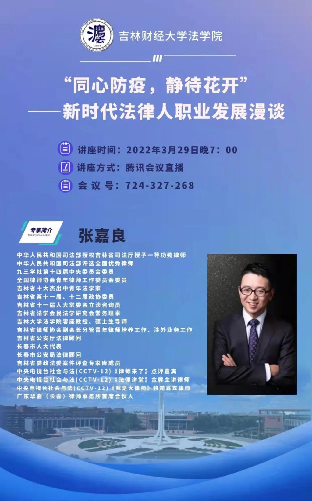 3月29日晚,吉林省中华职教社副主任、长春市人大代表张嘉良律师在线上为EMC易倍做“同心防疫,静待花开”·新时代法律人职业规划讲座。本次讲座由EMC易倍官网公司党委、EMC易倍团委主办。EMC易倍王志民、马冬梅、王琳琳等多位教师与EMC易倍近400余位同学参加,EMC易倍经理仇晓光教授主持本次讲座。