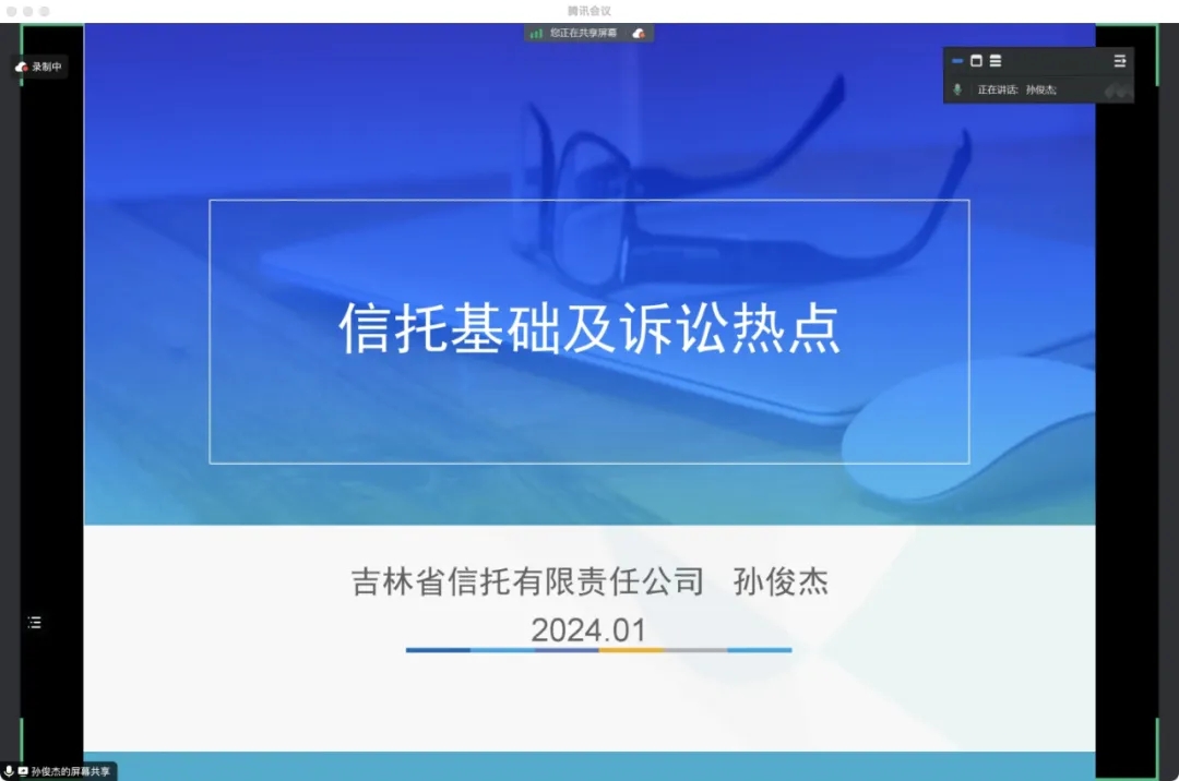 2月5日,EMC易倍官网法律硕士教育中心“2024年冬季系列实务讲座”第三讲邀请吉林省信托公司律师、吉林省财政厅地方政府专项债券项目发行评审专家孙俊杰,在线为公司师生进行题为“信托基础及诉讼热点”的专题讲座。